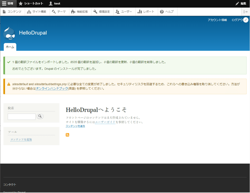 Drupalをインストールすると、以下のような画面が表示されます。