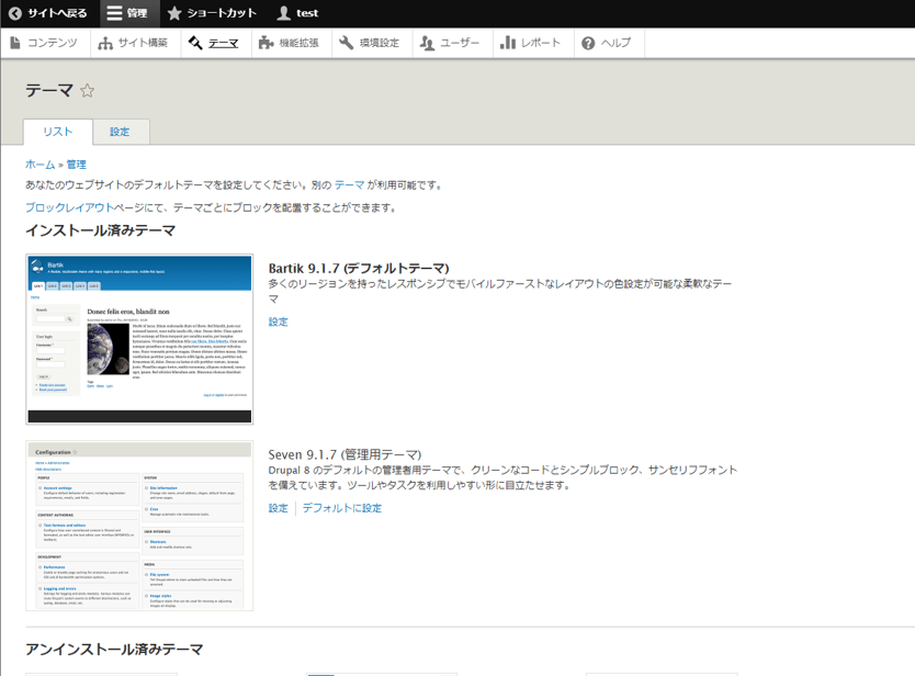 まず、Drupalに管理者ユーザでログインし、「テーマ」タブをクリックしてみてください。以下のような画面が出ますよね。