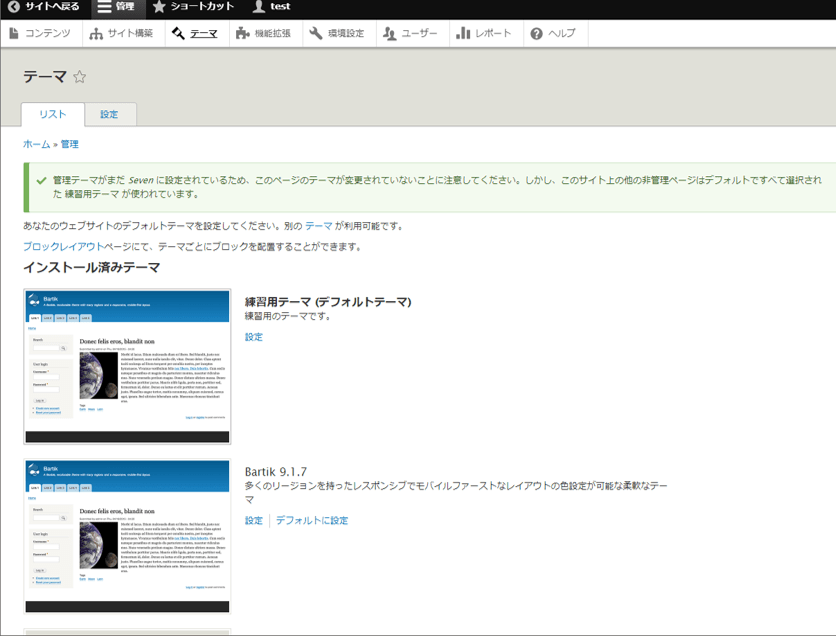 Drupalをインストールした直後は、「Bartik」というテーマが適用されている状態となります。