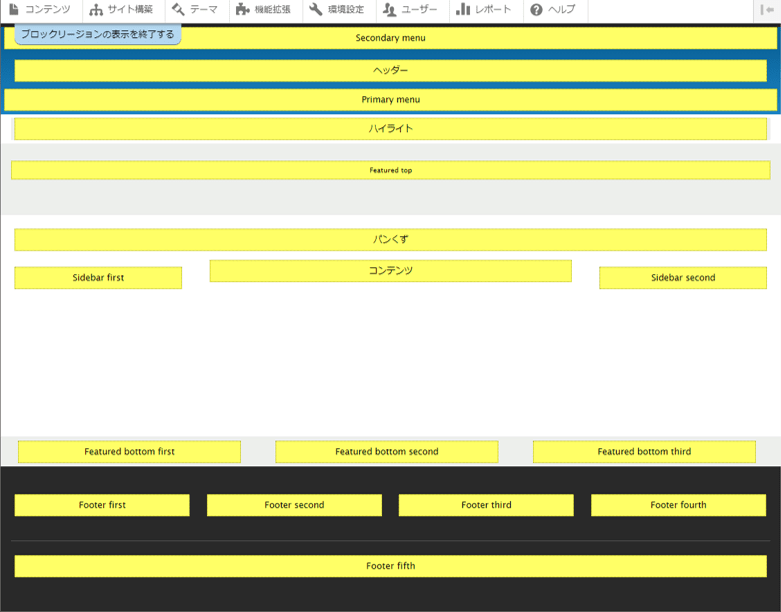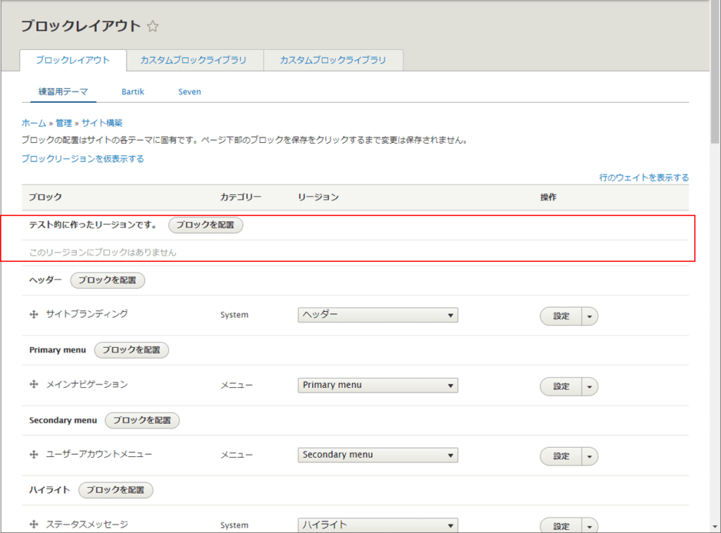 おおーありますね。しかし、「サイト構築」-「ブロックレイアウト」-「ブロックリージョンを仮表示する」を見てください。
