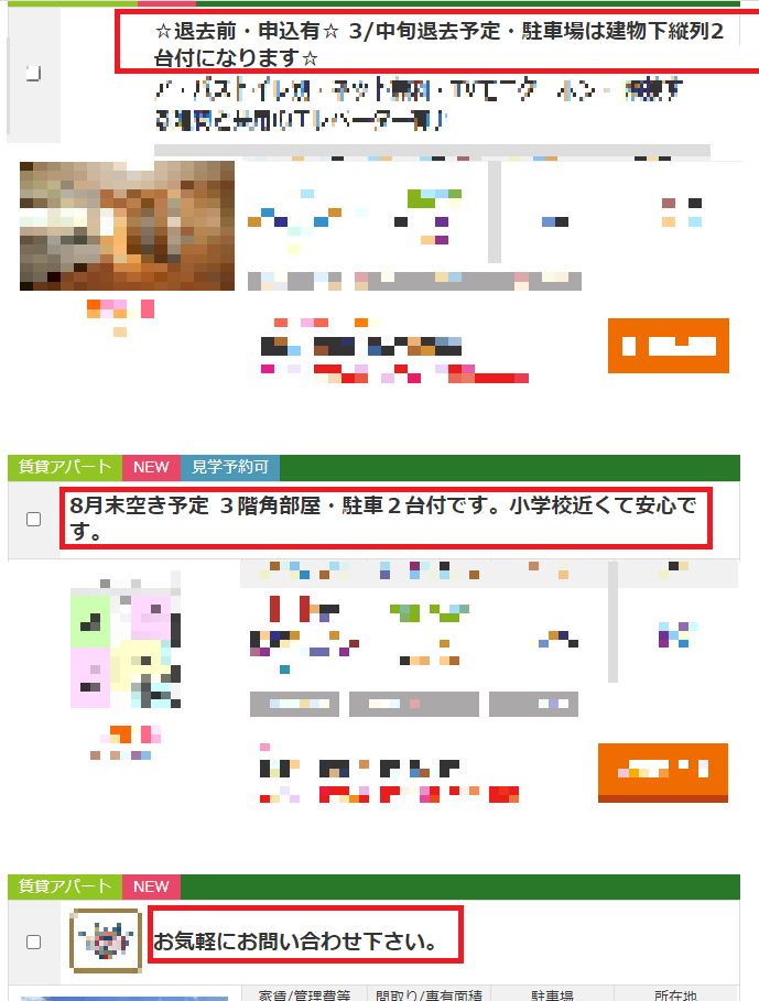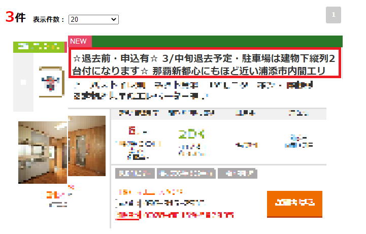 今回の場合、物件のタイトルとして使用されている「☆退去前・申込有☆ 3/中旬退去予定・駐車場は建物下縦列2台付になります」を探してみます。