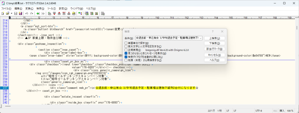 サクラエディタを開いたまま、キーボードで「ctl」+「f」を押して、「条件」に「☆退去前・申込有☆ 3/中旬退去予定・駐車場は建物下縦列2台付になります」を入れてEnterキーを押します。