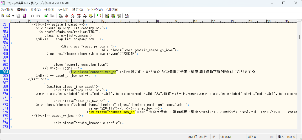 つまり、「div class=”comment web_pr」から始まる1行の文字を取得すれば物件名が取得できそうですね。