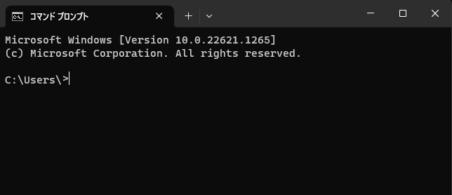 「Windows」キーをクリックし、「cmd」と検索すると「コマンドプロンプト」というアプリが表示されるので起動します。