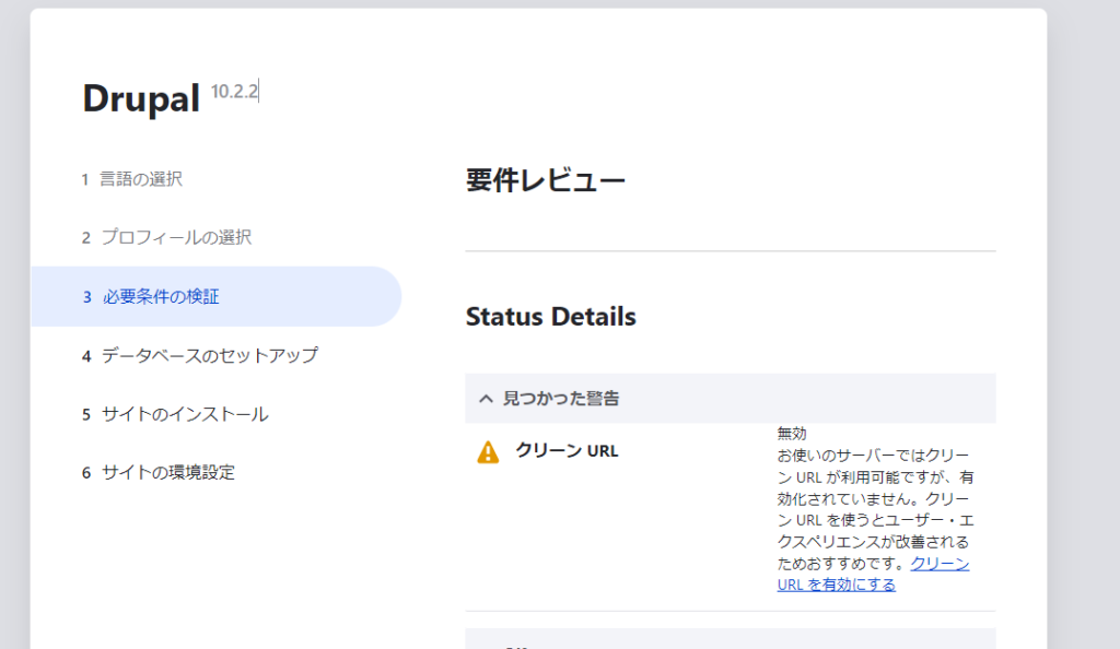 「クリーンURLを有効にする」について警告がありますが、画面下部の「とりあえず進む」をを押してみましょう。