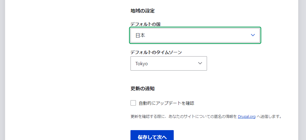 OSを再起動し、再度「http://【ローカル環境ipアドレス】/drupal/web」にアクセスし、「Save and continue」ボタンを押してみます。