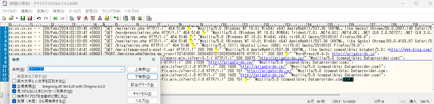 「「http://arigato-do.jp/」が存在している箇所は不正アクセスではない」という考えで、まずは「http://arigato-do.jp/」が含まれる行を検索してみましょう。