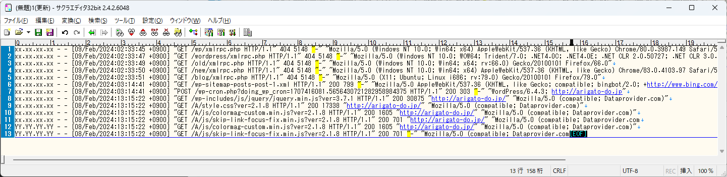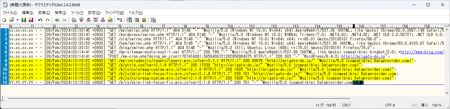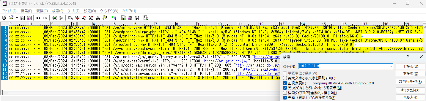 「xx.xx.xx.xx」が含まれた行だけを検索すると以下のようになってしまい、不正アクセスではないものまで抽出されます。